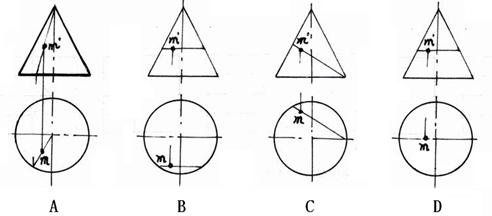 下图中已知圆锥表面上一点M的正面投影m.,补画其水平投影m的正确作图方法是: