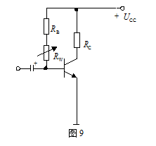 电路如图9所示,晶体管β=50,UBE=0.6 V,RB=72 k,RC=1.5 k,UCC=9V,当RW=0时,晶体管处于临界饱和状态,正常工作时静态集电极电流 IC Q 应等于3 mA,此时应把RW 调整为( )。