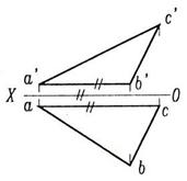在下图中用辅助投影法求三角形ABC平面的水平倾角α时,新投影轴应: