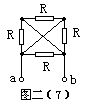 图二(7)的电路中,每个电阻R的阻值均为4Ω,则a、b端口的电阻为( )。